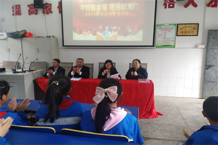 中经网·中经在线湖南衡阳讯(星航 通讯员:罗种棉)六年寒窗丰羽翼,今朝搏击翱长空。为了抓好毕业班学生最后的思想与复习工作,充分调动毕业班复习备考的积极性、主动性,帮助学生为小学学习生活划上圆满的句号,开启正式的初中学习大门,2023年5月11日,衡南县向阳桥联合学校中心小学学校领导和六年级全体师生在多媒体教室,召开了一场令人斗志昂扬的六年级毕业班誓师大会。
