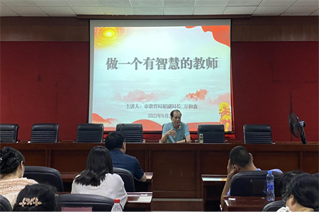 学校特邀市教育局原副局长万和森作专题讲座。他以《做一个有智慧的老师》为题,从教育的智慧在于唤醒、管理学生的智慧、课堂教学的智慧等几个方面进行阐述,他结合自身体会,以生动的小故事和风趣幽默的语言将为何要做有智慧的老师和如何做有智慧的老师这一深刻的道理诠释得通俗易懂。最后,他告诫老师们要“将阅读作为一种习惯”“将反思作为一种常态”“把激情作为一种动力”“把坚持作为一种支撑”……将近2小时的讲座,老师们听得全神贯注、聚精会神,深感收获颇丰。