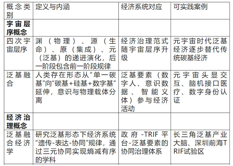 泛基融合经济学的核心结论是:人类社会正从“碳基实体时代”迈入“泛基融合时代”,经济治理的本质是适配“四次宇宙层序规律”与“泛基形态演化”,通过“政府-TRIF 4.0-泛基要素”三元协同,破解“管死放乱”与“技术异化”,实现“泛基要素有序、权利平等、共同繁荣”。