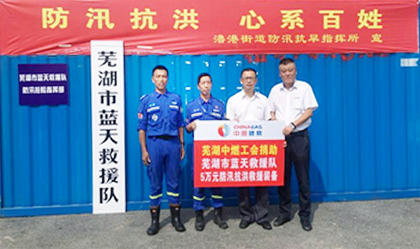 同年7月,在芜湖市抗洪防汛攻坚战中,芜湖中燃加大管网、用户、场站的巡检力度,对麻凤圩穿越漳河段、军滩穿越青弋江高压管道等重点地段,实施重点监督,保证24小时防汛不间断。此外,芜湖中燃工会还向芜湖市蓝天救援队捐赠了5万元防汛抗洪物资金。