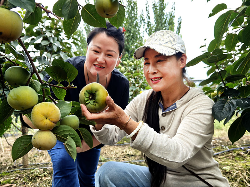进入果园,沁人的香气扑鼻而来,三四年树龄的果树,硕果累累,压弯了枝头。20多亩的甜脆柿新品种果实绿中透出金黄,每个足有半斤以上份量;咬一口太秋柿,有着苹果的甜、香梨的脆、哈密瓜的香,让人垂涎欲滴,回味无穷。