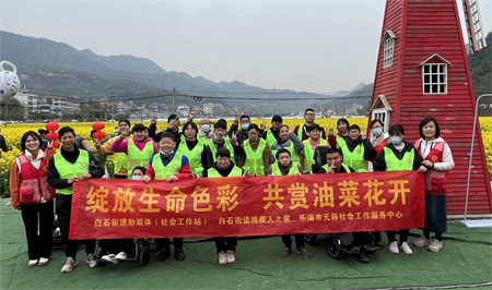 中经总网·中经在线浙江温州讯 阳春三月,春意盎然,正是油菜花盛开之时。为丰富残障人士的业余生活,感受大自然的气息,享受户外的乐趣。日前,乐清市白石街道助联体(社工站)、白石街道残疾人之家联合天籁社会工作服务中心开展了一场以“绽放生命色彩,共赏油菜花开”为主题的户外活动。在志愿者的带领下,残障朋友们领略了白石街道密川村油菜花田的美丽风光,一起分享健康美食。此次活动共有35位低保低边困难户的残障朋友和6位志愿者参加。