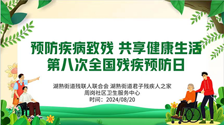中经总网·中经在线南京讯 8月25日是全国第八次残疾预防日。为推动《江宁区残疾预防行动计划(2022-2025)》贯彻实施,提高机构残疾预防宣传工作水平,促进残疾预防工作高质量发展,普及残疾预防宣传教育,增强全社会残疾预防意识。8月20日至25日,南京市江宁区湖熟街道残疾人联合会、湖熟街道君子残疾人之家、周岗社区卫生服务中心联合开展以“预防疾病致残,共享健康生活”为主题的宣传活动。