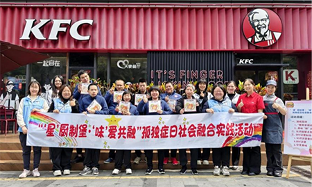 中经总网·中经在线广东东莞讯 4月2日是第十八个世界孤独症日。东莞市残疾人托养中心(以下简称中心)组织学员到肯德基“天使餐厅”开展社会融入实践活动。学员们在老师和项目社工的陪同下,通过互动游戏、职业体验等形式,感受社会温暖,提升社交能力。