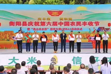 中经总网.中经在线湖南衡阳讯(罗召俊 通讯员 李小华)金秋时节,又逢秋分,稻黍成熟、瓜果飘香,丰收的喜悦弥漫衡阳县库宗桥镇华山村,稻田里九台收割机机声隆隆,来往不息,村部广场掌声阵阵,喝彩不断。9月23日,衡阳县庆祝第六届“中国农民丰收节”暨“角山米业杯”篮球大赛(村BA)启动仪式在这里举行。