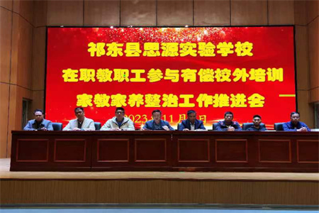中经总网·中经在线湖南祁东讯(张星兴 通讯员 周利平 彭双妹)为了切实规范教师从教行为,促进教师依法从教、廉洁从教,培养一支师德高尚、爱岗敬业的教师队伍,办好人民满意教育,11月9日晚,祁东县思源实验学校召开了在职教职工有偿校外培训、家教家养整治工作推进会。全体教职员工参加会议,会议由肖耿华校长主持。