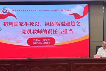 中经总网·中经在线湖南衡阳讯(张星兴 通讯员:肖文胜) 2025年4月10日下午,衡阳市第三中学党总支开展"一月一课一片一实践"主题党日活动。活动中学校党总支书记肖文胜同志为全体在职党员及退休党员代表上了一场题为《苟利国家生死以,岂因祸福避趋之》的党课。精彩生动的党课,令在场党员倍受鼓舞。