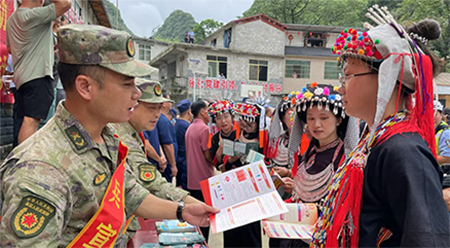 中经总网·中经在线广西巴马讯 2024年秋季征兵工作即将拉开帷幕,为做好征兵宣传工作和营造氛围,鼓励瑶山广大适龄青年踊跃报名参军。7月4日,广西巴马瑶族自治县东山乡在瑶族“祝著节”庆祝活动奏响2024秋季征兵宣传曲,为群众和适龄青年宣传参军入伍政策,有效动员辖区大学生、适龄青年积极响应祖国号召,投身国防建设。