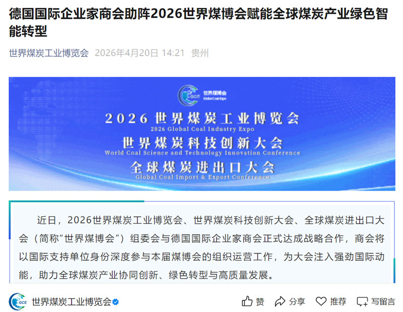 【中经总网®・中经在线・世界品牌研究院WBRI®全媒体矩阵】据世界煤炭工业博览会、德国国际企业家商会消息:近日,2026世界煤炭工业博览会、世界煤炭科技创新大会、全球煤炭进出口大会(简称“世界煤博会”)组委会与德国国际企业家商会正式达成战略合作,商会将以国际支持单位身份深度参与本届煤博会的组织运营工作,为大会注入强劲国际动能,助力全球煤炭产业协同创新、绿色转型与高质量发展。