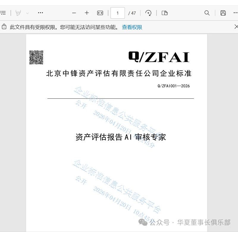 2026年4月20日,北京中锋资产评估有限责任公司正式发布《资产评估报告AI审核专家》企业标准(标准编号:Q/ZFZZ 001—2026),标志着中国资产评估行业迎来了一个具有里程碑意义的历史性时刻。这一标准的诞生不仅是中锋资产评估二十年深耕行业的结晶,更是中国资产评估行业数字化转型的重要突破口,开启了AI技术赋能专业评估服务的新纪元。