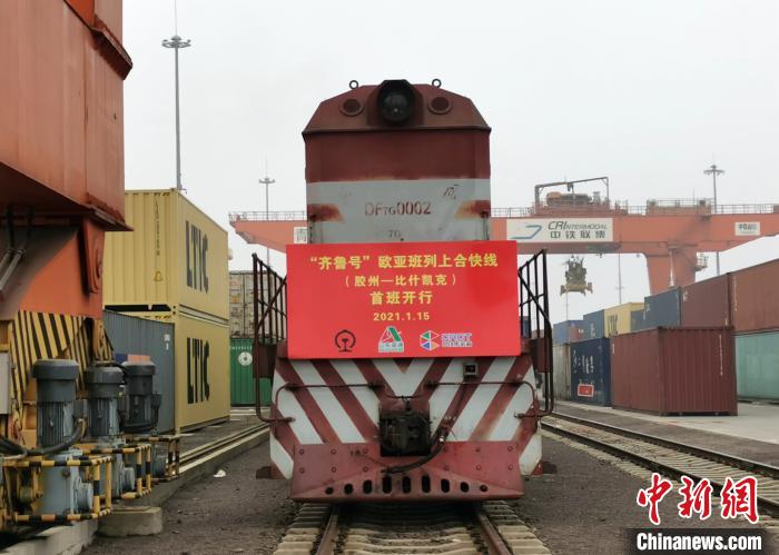 中新网青岛1月15日电 (记者 胡耀杰)“齐鲁号”欧亚班列“上合快线”胶州至比什凯克线路15日在中国—上海合作组织地方经贸合作示范区(简称“上合示范区”)青岛多式联运中心发出首班列车。该趟班列载有日用百货、机械零配件等货物,共计108个标准箱,由位于青岛胶州的上合示范区青岛多式联运中心发出,经霍尔果斯出境,预计12天后到达吉尔吉斯斯坦首都比什凯克。