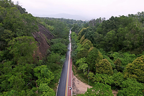 会同-那洲绿道环线全程10公里串连起了那洲社区、会同社区的多个村庄,形成闭环状路线。从高新区唐家湾镇会同古村出来,沿着那溪河边上的绿道,往那洲方向走约2公里,即可到达一个古桥,桥头处设有充满版画元素的岭南标识牌,上方写着“美丽那洲”,即为会同-那洲绿道环线新建部分的起始点,那洲也是版画大师古元的故乡。沥青铺就的绿道,以彩色带为分隔线,设有自行车道、人行道;可骑行、漫步、慢跑。一河两岸,山环水绕;有山景、村庄、菜园、那溪河叠水;沿途可领略水岸风情、绿色田园风光。环线中设置亲水平台、休憩点,可供游客拍照打卡、停歇休息。