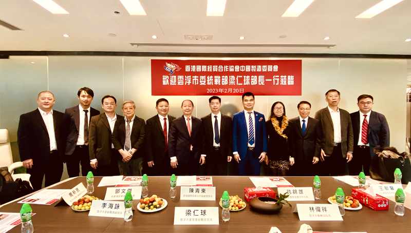 2023年2月20日,香港国际经贸合作协会中国制造委员会热烈欢迎云浮市委常委、统战部部长梁仁球、云浮市政协党组副书记、副主席罗梓健和市委统战部副部长李海咏、市政协港澳台侨外事委主任杨伙清、市侨务局局长林伟祥、市委统战部港澳社团联络科科长周新民一行莅临访问。