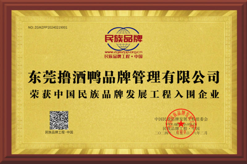 经中国民族品牌发展工程组委会专家评审,东莞撸酒鸭品牌管理有限公司荣获中国民族品牌发展工程入围企业,为民族品牌赋能,树立民族品牌形象,实现民族品牌核心价值观。