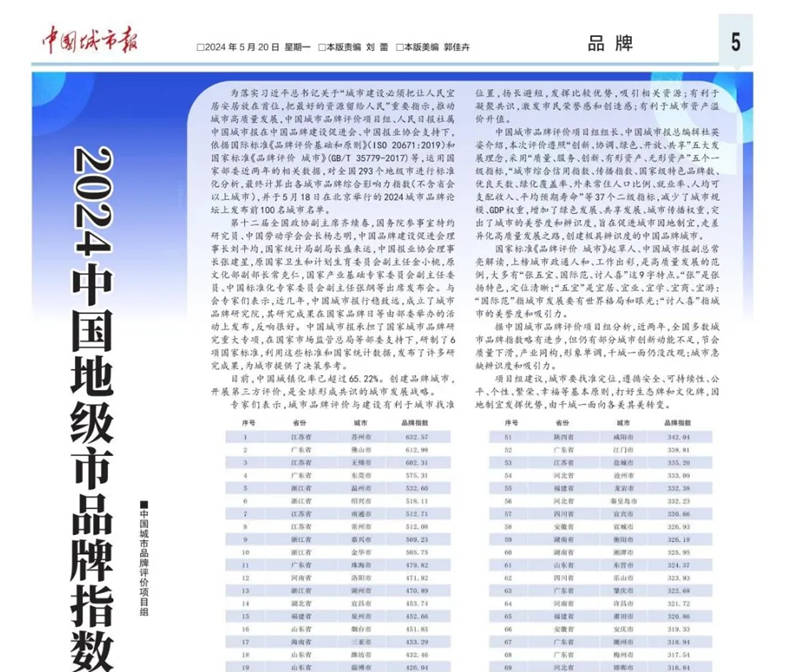 中国城市品牌评价项目组、人民日报社属中国城市报在中国品牌建设促进会、中国报业协会支持下,依据国际标准《品牌评价基础和原则》(ISO 20671:2019)和国家标准《品牌评价城市》(GB/T 35779-2017)等,运用国家部委近两年的相关数据,对全国293个地级市进行标准化分析,最终计算出各城市品牌综合影响力指数(不含省会以上城市),并于5月18日在北京举行的2024城市品牌论坛上发布前100名城市名单。