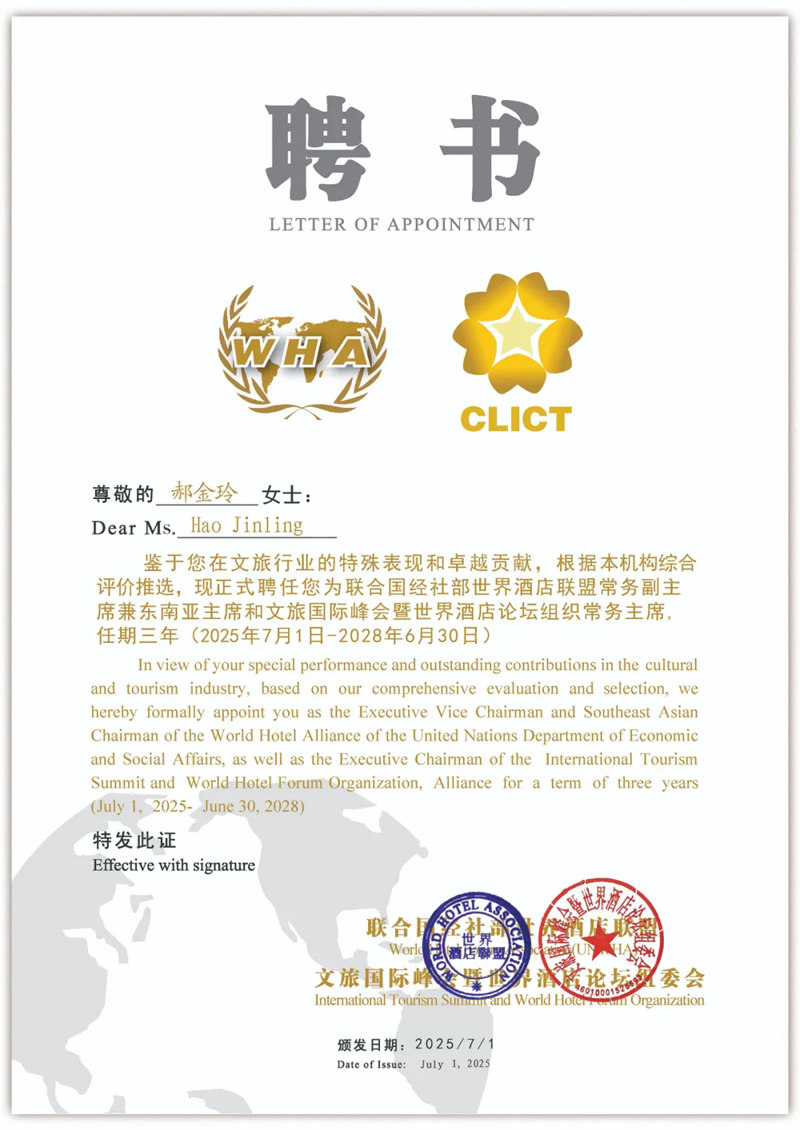 经研究决定,现正式聘请郝金玲担任联合国经社部世界酒店联盟常务副主席兼东南亚主席和文旅国际峰会暨世界酒店论坛组织常务主席。任期三年,自2025年7月1日起生效。